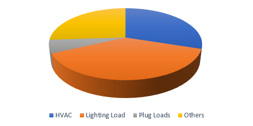 With respect to load types, there are three major loads in commercial and residential buildings: HVAC, lighting and plug loads. According to the data from EIA published in 2008 , electricity use by HVAC equipment, i.e., space heating, cooling and ventilation accounts for 30% of the total electricity consumption in buildings. Lighting loads constitute the majority share of electricity use at 38%. Electricity use by plug loads, i.e., office equipment, computers, etc. accounts for 6% of total electricity use in buildings. Other loads include water heating, refrigeration, elevators, etc. The figure below illustrates electricity use in buildings by load type. With the development of Information and Communication Technologies (ICT) and sensor networks, new applications including A Building Management System (BMS) are constantly emerging to increase energy efficiency.